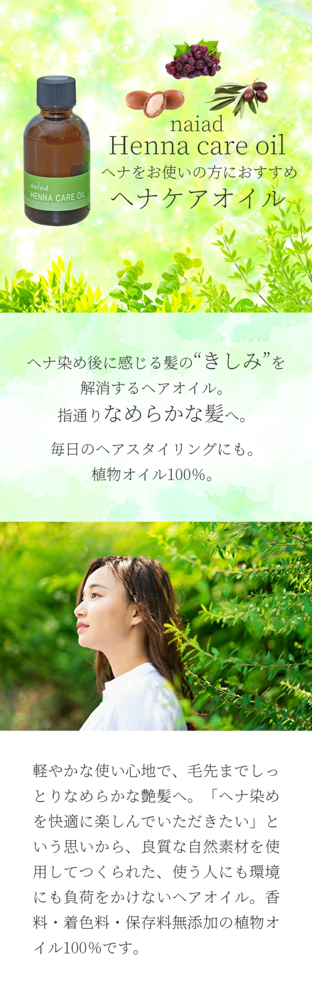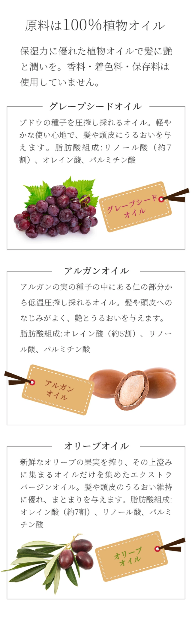 | ナイアードモロッコの工房内で搾油したアルガンオイルと、同工房で育ったオリーブから搾った無農薬のオリーブオイルをヘアケアに適した配合でブレンド。 ヘナユーザーの悩みの一つである「ヘナ染め後に感じるきしみ」を緩和し、指通りなめらかな髪を保ちます。 「自然素材で白髪を染めたい」というお客様の思いに寄り添い、着色料や防腐剤等の合成成分はもちろん、精油や天然香料も一切不使用。 毎日のヘアケアにもご使用いただくことで、次の髪染めまで髪の毛全体を美しく保ちます。 ヘナ染め後だけでなく、毎日の洗髪の後のお手入れやスタイリング、頭皮マッサージにもご使用ください。 ・髪染めによる一時的な髪のきしみを緩和し、ゆび通りの良い髪に保つヘアオイル ・保存料、香料、着色料等の添加物は一切不使用 ・さらっと軽やかな使い心地で、毛先までしっとりなめらかな艶髪へ導く ・シャンプー後の保湿やヘアスタイリングに ・ヘナユーザーでない方にも毎日のヘアケアやスタイリングにおすすめ ・頭皮のマッサージオイルとしても <使用オイル> アルガンオイル アルガンの実の種子の中にある仁の部分から低温圧搾し採れるオイル。髪や頭皮へのなじみがよく、艶とうるおいを与えます。 脂肪酸組成:オレイン酸(約5割)、リノール酸、パルミチン酸 オリーブオイル 新鮮なオリーブの果実を搾り、その上澄みに集まるオイルだけを集めたエクストラバージンオイル。髪や頭皮のうるおい維持に優れ、まとまりを与えます。 脂肪酸組成:オレイン酸(約7割)、リノール酸、パルミチン酸 グレープシードオイル ブドウの種子を圧搾し採れるオイル。軽やかな使い心地で、髪や頭皮にうるおいを与えます。 脂肪酸組成:リノール酸(約7割)、オレイン酸、パルミチン酸 <使用期限> 未開封時:(製造年月より)3年 開封後の使用期限の目安:6ヶ月 ※開封後はなるべく早めにお使いください。 |