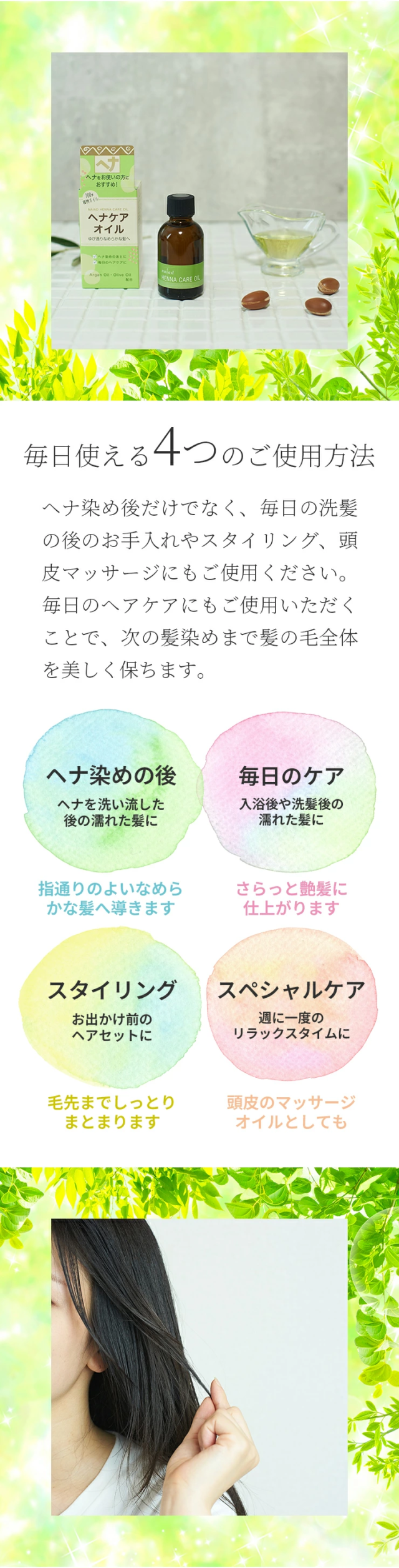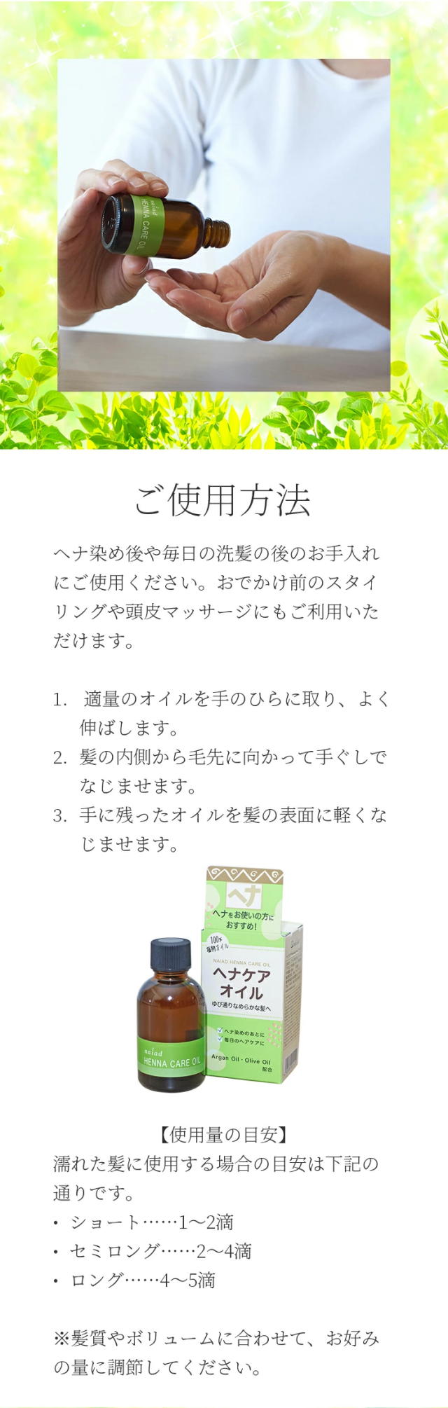 | ヘナ染め後や毎日の洗髪の後のお手入れにご使用ください。おでかけ前のスタイリングや頭皮マッサージにもご利用いただけます。 1. 適量のオイルを手のひらに取り、よく伸ばします。 2. 髪の内側から毛先に向かって手ぐしでなじませます。 3. 手に残ったオイルを髪の表面に軽くなじませます。 【使用量の目安】 濡れた髪に使用する場合の目安は下記の通りです。 ●ショート……1〜2滴 ●セミロング……2〜4滴 ●ロング……4〜5滴 ※髪質やボリュームに合わせて、お好みの量に調節してください。 【ヘナペーストに混ぜてもOK】 ヘナの粉とお湯を混ぜてペーストを作った際にヘナケアオイルを混ぜることもできます。ペーストがなめらかになり根元まで塗りやすく。洗い流しがさらっと簡単に。しっとり、なめらかな指通りになります。ヘナの粉100g:ヘナケアオイル20〜25適(小さじ1弱)が目安です。いつも通りヘナ染めしてください。 ※髪の量や髪質によって仕上がりが変わります。お好みに合わせて調整してください。 ※ヘナケアオイルを入れすぎるとペーストが垂れる可能性があります。ご注意ください。 |