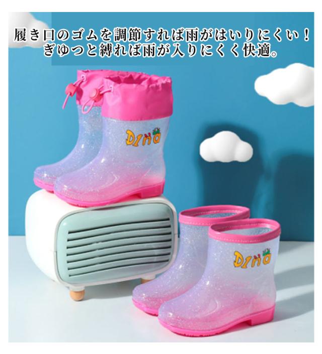 | 雨の日も笑顔で通園、通学できるオススメアイテム! スッキリとしたシルエットにキラキラクリアデザインがキュート。 シンプルなクリアデザインにキラキララメが足もとを可愛く演出します。 履き口が大きく、柔らかい素材なので脱ぎ履きが楽ちん。 履き口のゴムを調節すれば雨がはいりにくい!ぎゆつと縛れば雨が入りにくく快適。 キャンプに、旅行に、通学に!男女兼用・みんなで使えるレインブーツ。 | |