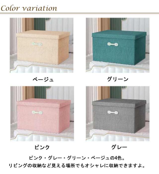 | 衣類、書類、おもちゃやその他の生活用品と事務用品など用途別にたっぷり収納するボックス! ふた付きなのでホコリがかぶったり、中が見える心配もありません。 カラーボックスに合うサイズなので、見た目もスッキリ収納ができます。 正面に取っ手が付いているので、持ち運びや出し入れにも便利です。 頑丈仕様なので2つを積み重ねてもOK。ふたがしっかりしているので、沈んでしまう心配もありません。 折りたたみもできて使わないときは、すごくコンパクトになります。 ピンク・グレー・グリーン・ベージュの4色。リビングの収納など見える場所でもオシャレに収納できますよ。 | |