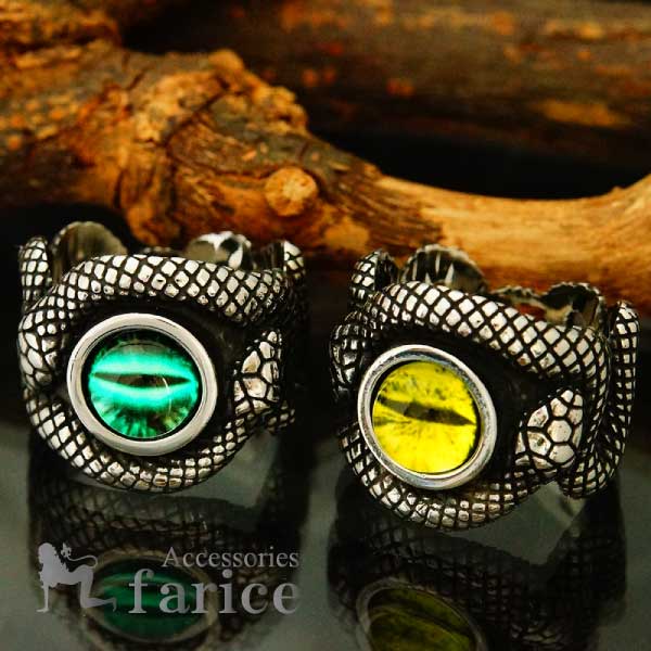 指輪 スネークアイ ガラス 目玉 石を守る2匹の蛇 ハード 蛇 ステンレス メンズリング 【グリーン/イエロー】