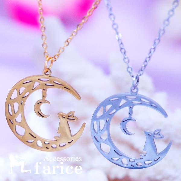 ・三日月を見上げるお月見うさぎの横顔がかわいいダブルムーンモチーフのネックレス