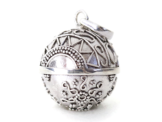 JAWANタイプは、真鍮製の音を奏でるボールを球状の銀のボールで包み、その表面に、さらに銀の粒と銀を細い糸状にしたもので装飾されたガムランボールです。