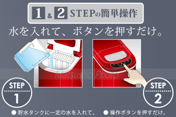 お水を入れてボタンを押すだけ!約6〜13分の高速製氷。貯水タンクに一定の水を入れて操作ボタンを押すだけのワンツーステップの簡単操作。用途に合わせて大、小2サイズの氷が選択できます。氷の製氷形状は穴あきキャップ型になります。暑い夏、冷蔵庫の氷だけじゃ足りない・・家族が多くて氷がすぐになくなる・・パーティやイベントで氷が多量に必要・・そんなときには高速製氷機があると便利です。■本体寸法約W245×D365×H325mm■本体重量約8.8kg■電源AC100V 50/60Hz■消費電力110W■貯水容量約2.2L(タンク)■氷保管量約800g■約6〜13分(目安)※使用環境温度や使用状況により異なります■製氷能力約12kg/日(目安)※使用環境温度や使用状況により異なります■コード長さ約1.8m■付属品:アイススコップ、取扱説明書(保証書)■カラー:レッド※数値は目安です。使用環境温度や水温等により異なります。本製品は一般家庭用です。業務用等にご使用にならないで下さい。