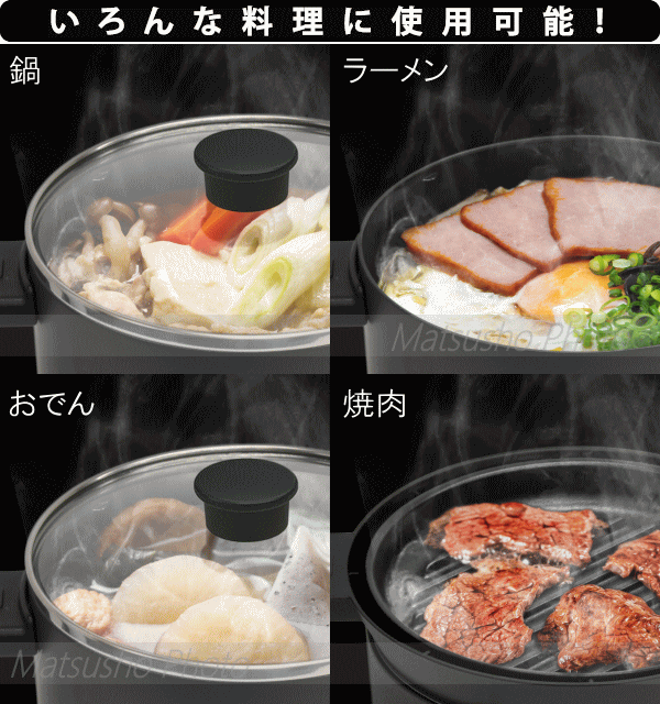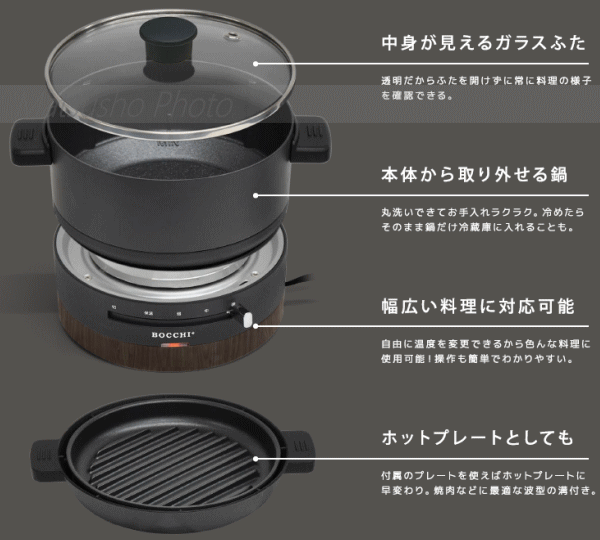 お鍋、ラーメン、おでん、焼肉などいろんな料理に使用可能!透明だからふたを開けずに常に料理の様子を確認できる中身が見えるガラスふた。本体から鍋が取り外せるので丸洗いができてお手入れラクラク。冷めたらそのまま鍋だけ冷蔵庫に入れることも。自由に温度を変更できるからいろんな料理に使用可能!操作も簡単でわかりやすく幅広い料理に対応可能。付属のプレートを使えばホットプレートに早変わり。焼肉に最適な波型の溝付き。■サイズ[本体]約W225×D200×H180mm(鍋・ガラスふた含む)[鍋]直径170×深さ80mm■重量約1.2kg(鍋・ガラスふた含む)■電源AC100V 50/60Hz■定格消費電力600W■鍋容量約1L■コード長約1.8m■温度調節範囲:保温〜約250℃■材質[鍋、波型プレート]アルミ(テフロンコーティング)[ガラスふた]強化ガラス■セット内容:本体、鍋、ガラスふた、波型プレート、プレートラック、取扱説明書(保証書)※数値は目安です。使用環境・状況により異なります。本製品は一般家庭用です。業務用等にご使用にならないで下さい。