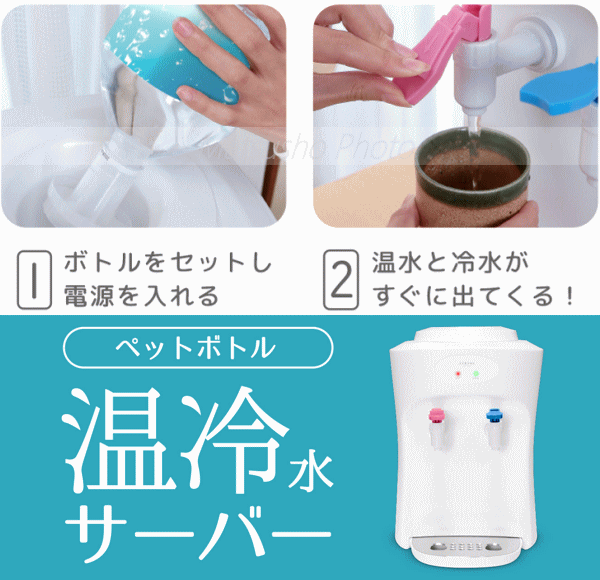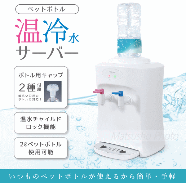 いつものペットボトルが使えるから簡単・手軽!ボトルをセットして電源を入れれば温水と冷水がすぐに出てくる。ボトル用キャップが2種付属しているので幅広い口径のボトルに対応!温水チャイルドロック機能が付いているのでお子様にも安心。2Lペットボトルも使用可能です。■本体寸法約W285×D340×H415mm■本体重量約4kg■電源AC100V 50/60Hz■定格消費電力[冷水器]60W[ヒーター]335W■冷水[タンク容量]約0.6L[温度]15℃■温水[タンク容量]約0.8L[温度]85℃■使用環境:屋内0〜38℃の環境下でご使用下さい■コード長約1.8m■カラー:ホワイト【大型商品のため同梱発送不可】※数値は目安です。使用環境・状況により異なります。本製品は一般家庭用です。業務用等にご使用にならないで下さい。