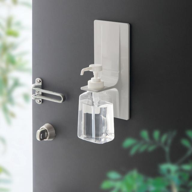 除菌用のプッシュポンプタイプのディスペンサーボトルを浮かせて保管・使用できるホルダーです。ボトルを浮かせることで、直接的な接触を避け、衛生的に保管できます。また、消臭スプレーなどのピストルタイプのスプレーボトルも、ホルダーの穴に掛けて保管できます。