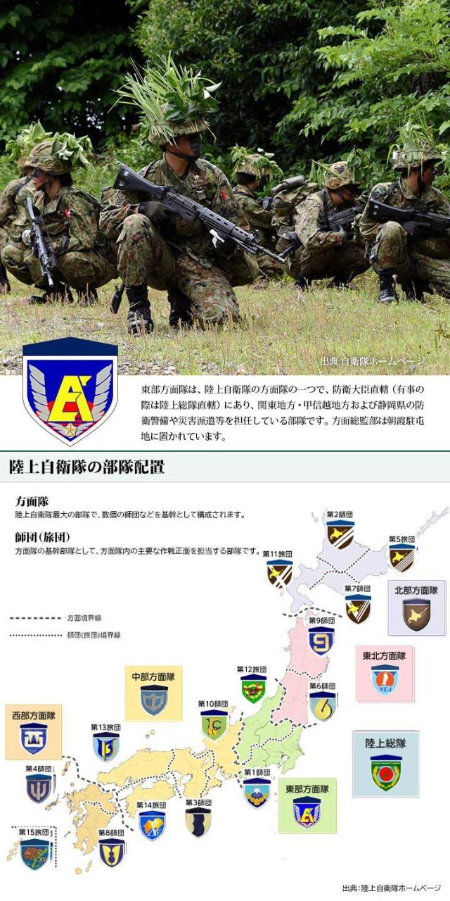東部方面隊は、1個師団及び1個旅団を基幹兵力としており、管内には34個の駐屯地、2個の分屯地、11個の地方協力本部(旧地方連絡部)が配置され、関東地方・甲信越地方および静岡県の防衛警備や災害派遣等を担任しています。