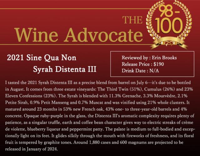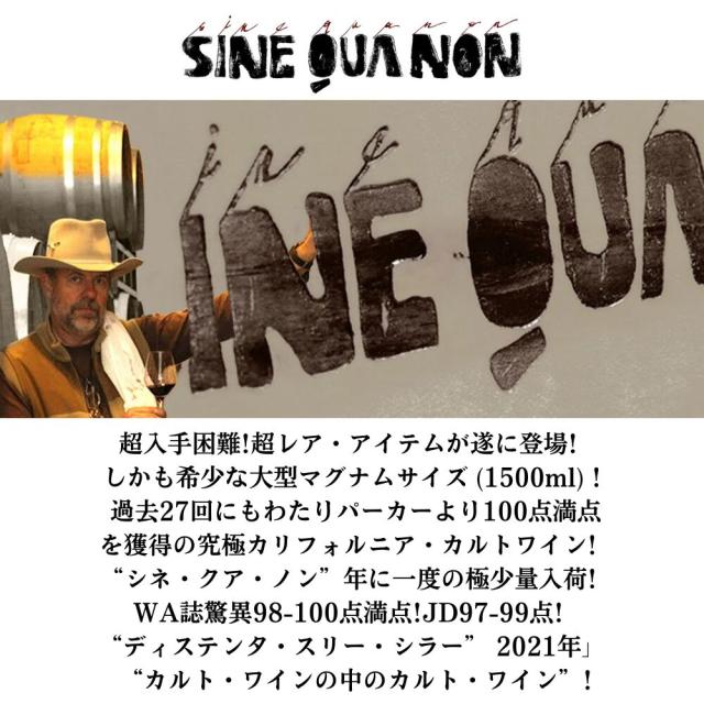 超入手困難!超レア・アイテムが遂に登場! しかも希少な大型マグナムサイズ(1500ml)! 過去27回にもわたりパーカーより100点満点 を獲得の究極カリフォルニア・カルトワイン! “シネ・クア・ノン”年に一度の極少量入荷! WA誌驚異98-100点満点!JD97-99点! “ディステンタ・スリー・シラー”2021年」 “カルト・ワインの中のカルト・ワイン”!