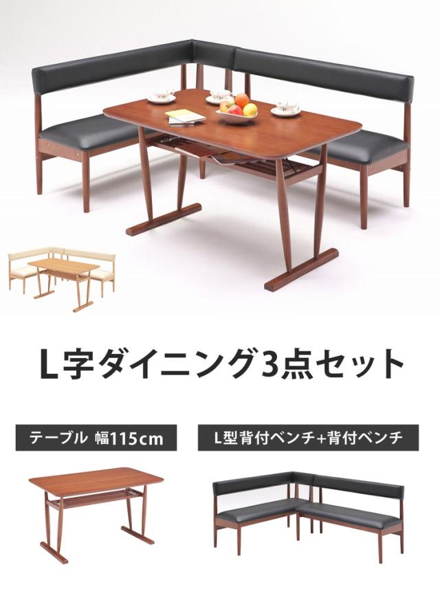 L字ダイニング3点セット テーブル幅115cm ベンチ幅123cm~131cm L字 L字チェア 木目調 リビング ダイニングテーブルセット 4~5人掛け(代引不可)【送料無料】