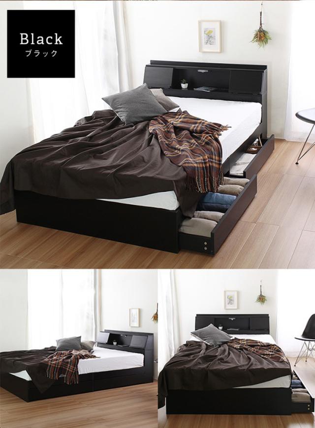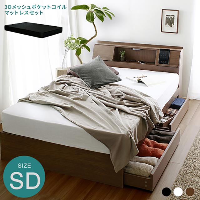 寝具 おしゃれ 多機能ベッドフレーム FLAP フラップ ブラックマットレスセット SD セミダブル モダン 収納 引き出し コンセント付き 棚 フラップ扉 ライト 木製