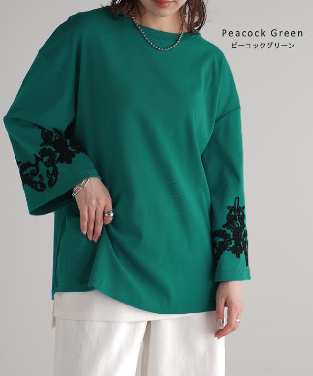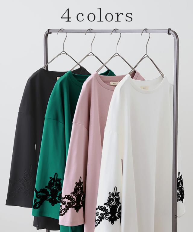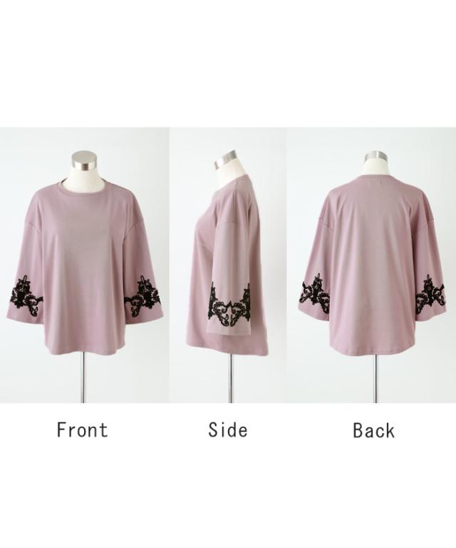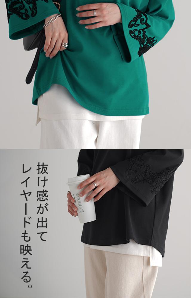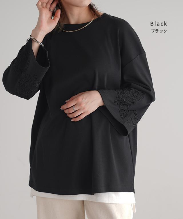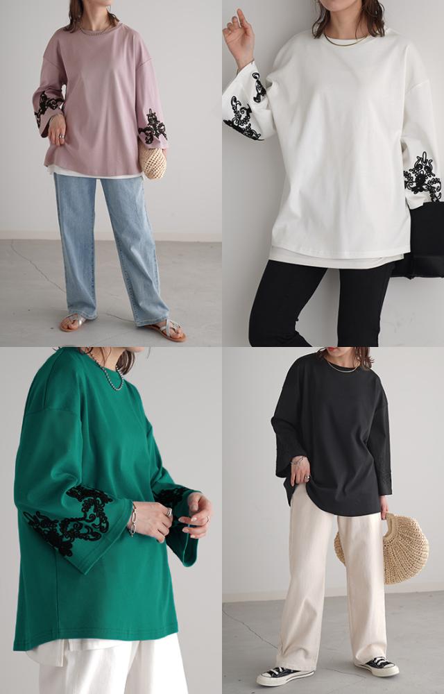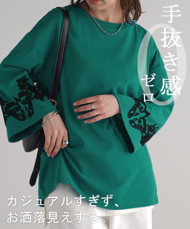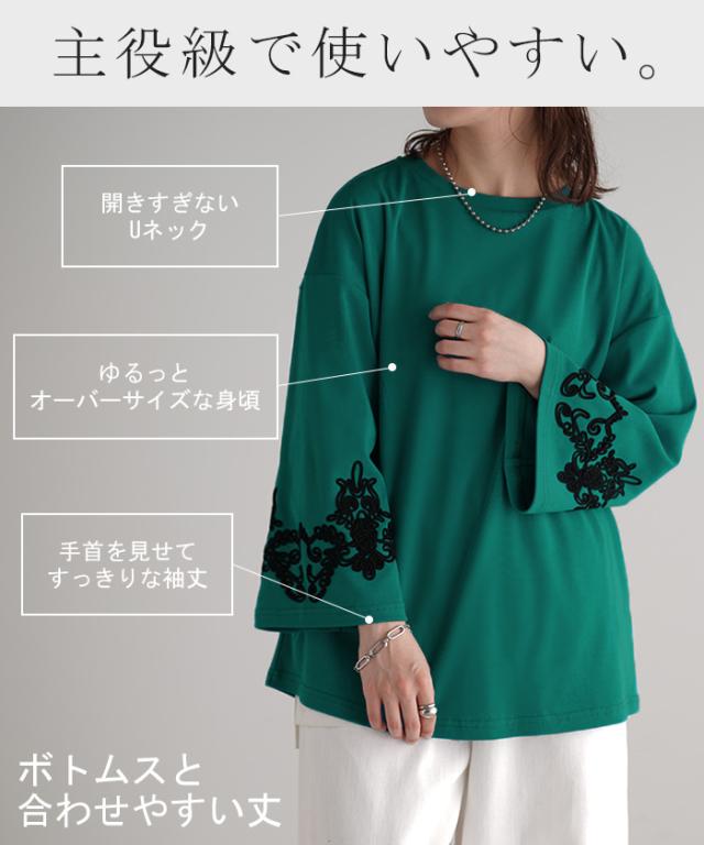 コード刺繍使いで袖コンシャスの見映えがポイントのカットソーです。