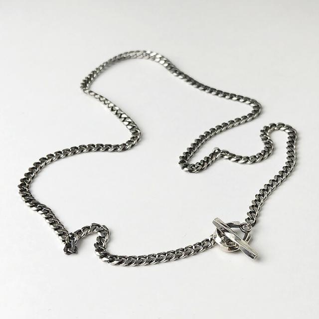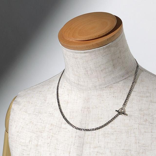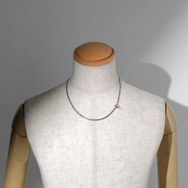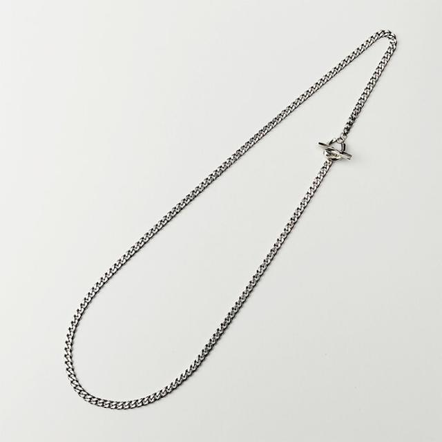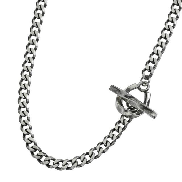 留め具がホースシュー(馬蹄)デザインになった、ユニークなマンテルネックレスです。チェーン部分はシンプルすぎずギラギラもしすぎない、程よい輝きを実現する6面カット喜平。シルバーの輝きと燻しの黒が存在感とこなれ感を演出するので細めでも様になります。普通に着けても留め具を見せるように着けてもコーデのアクセントになってくれるアイテムです。