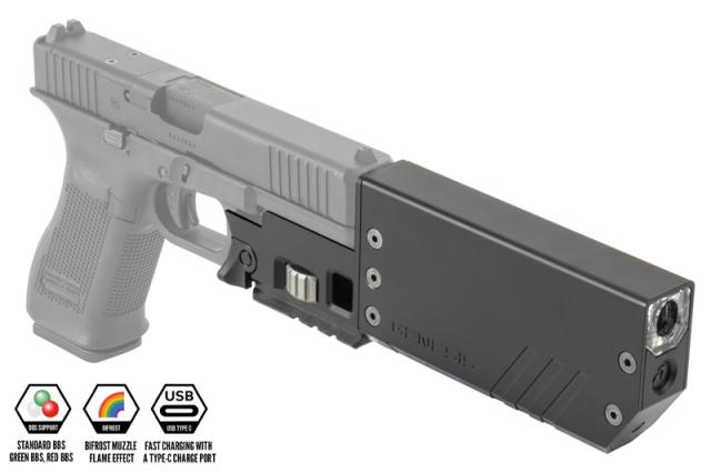 緑色蓄光弾と赤色蓄光弾の両方に対応したトレーサー機能に加え、7色のエフェクト発光が可能なBIFROST機能付き特製ユニットを内蔵。