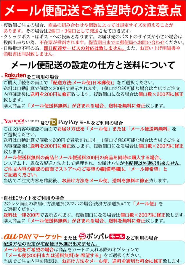 メール便発送はサイズ規定がある為パッケージを外しての発送となります。その場合、商品の返品・交換はお受けできません。ご了承の上お買い求めください。