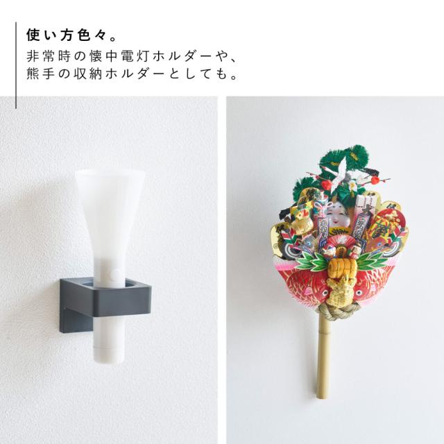 非常時の懐中電灯ホルダーや、熊手の収納ホルダーとしても。※熊手は根本まで差し込んで荷重を本体で受けるように設置してください。