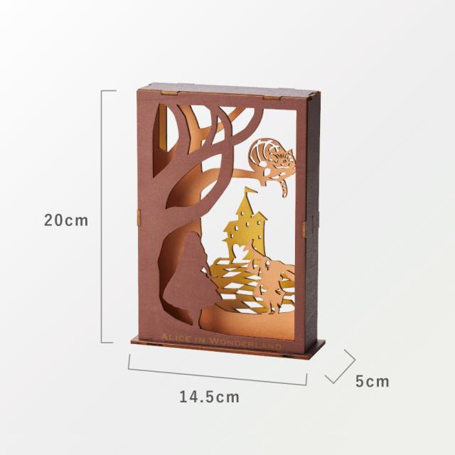 木製パズルを組み立てるとシャドウボックスライトに。アリスの世界が広がります。