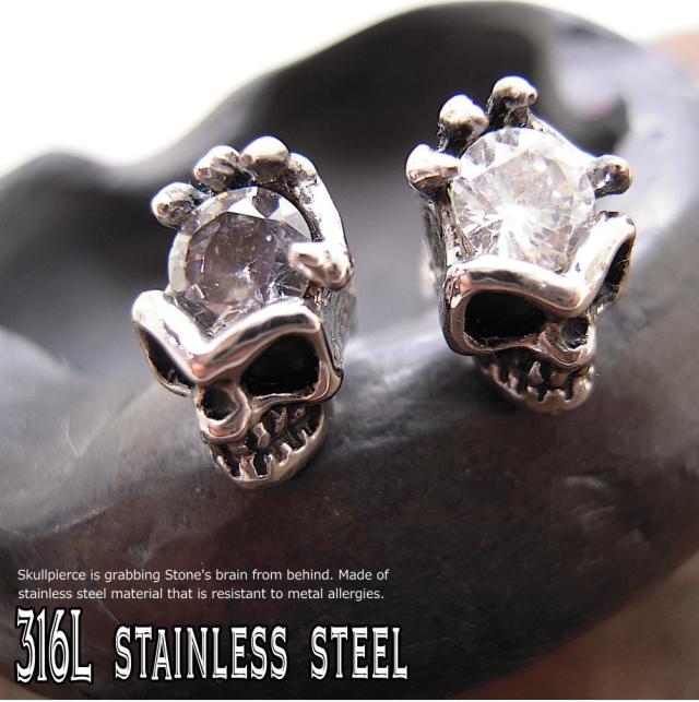 ストーンの脳を後ろから掴んでいる印象的で立体感のあるスカルピアス。金属アレルギー対応のステンレス素材です。