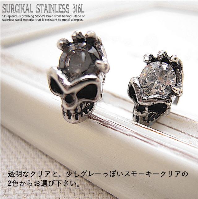 メンズ ピアス 石をつかんだ スカル ドクロ ガイコツ アレルギー対応 316L ステンレスピアス セカンドピアス CZ スタッドピアス 20G 片耳用 1個売り1-971