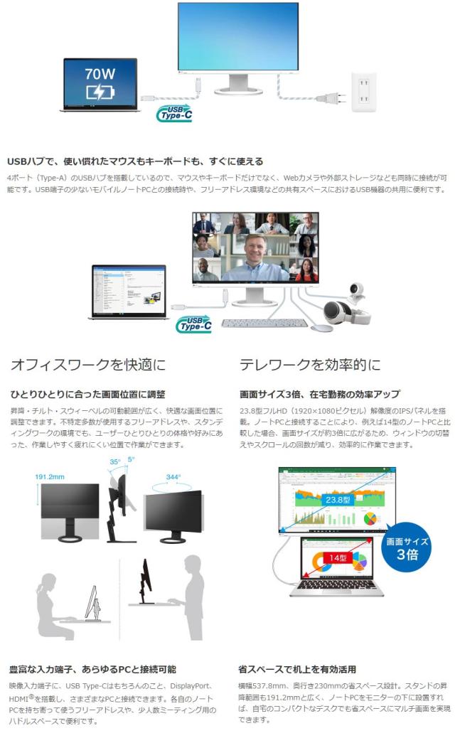IPSパネル採用 フルHD対応23.8型ワイド液晶ディスプレイ USB Type-C 70W給電対応 FlexScan EV2480-ZBK