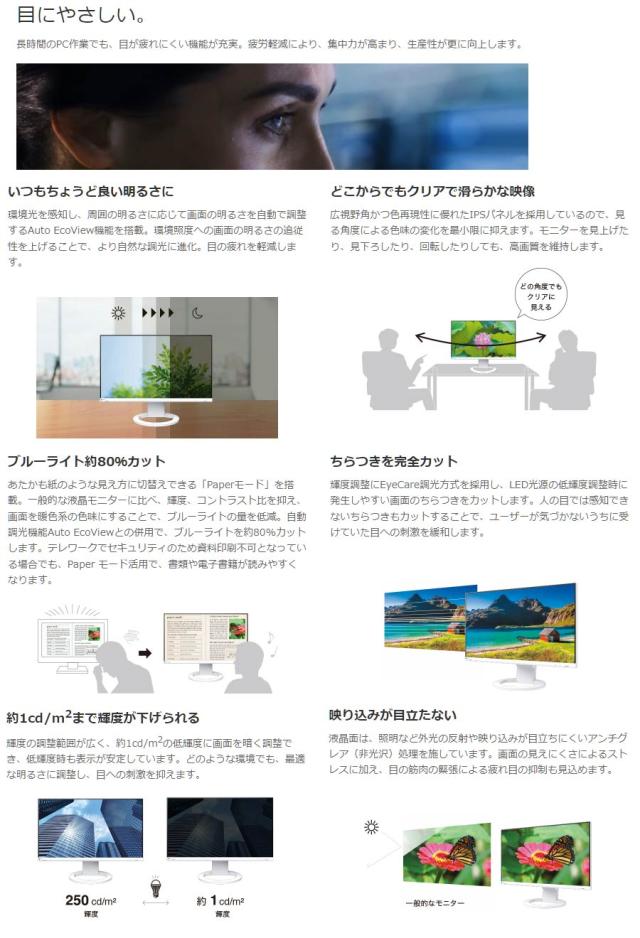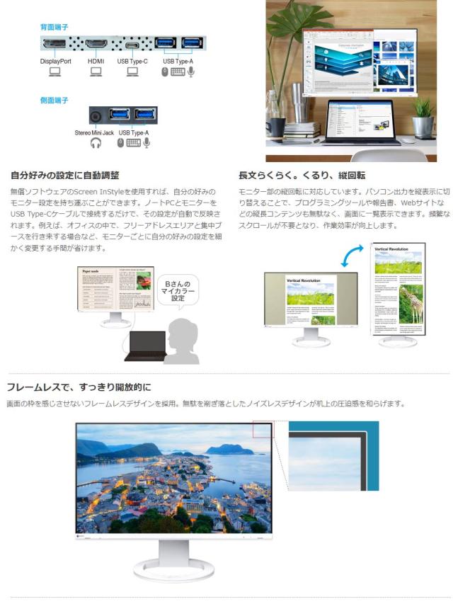 | IPSパネル採用 フルHD対応23.8型ワイド液晶ディスプレイ USB Type-C 70W給電対応 FlexScan EV2480-ZBK スペック情報 | |