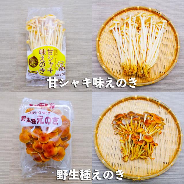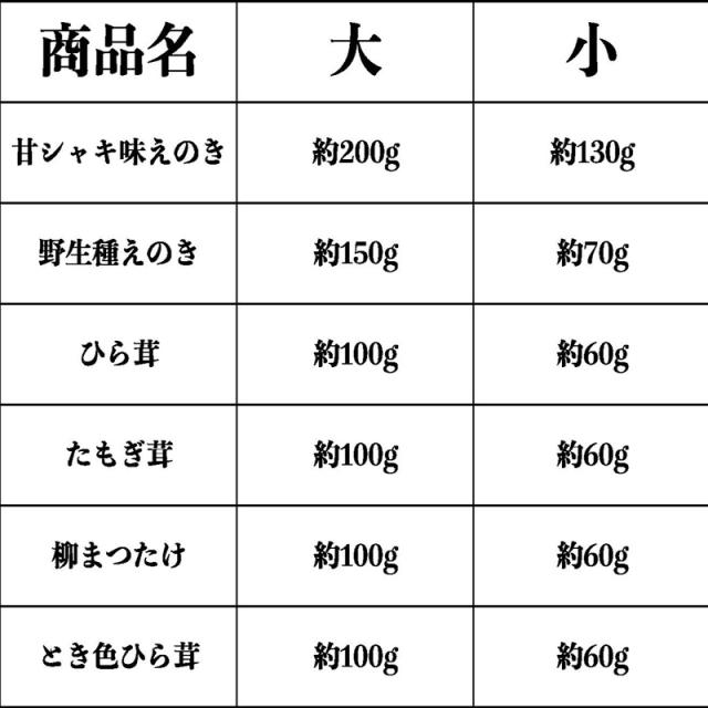 かさが大きく1本1本がしっかりとした歯ごたえの甘シャキ味えのき(約200g)・野生種えのき(約150g)、クセがなくボリューミーなひら茸(約100g)。さらに、香り高く歯ごたえの良いのたもぎ茸(約100g)と、香り高く繊細な柳まつたけ(約100g)、美しいピンク色にさっぱりとした食感のとき色ひら茸(約100g)。