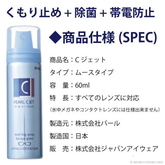 強力 くもり止め メガネ レンズ 眼鏡 ムースタイプ くもり止め C-JET ムースタイプ 60ml Cジェット シージェット パール PEARL 除菌 エアゾール 曇り止め レンズ PEARL 日本製