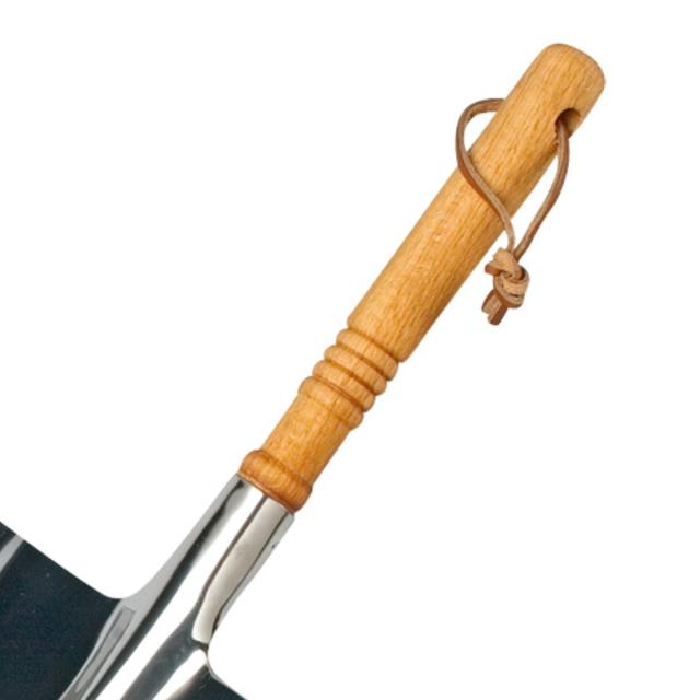 ハンドル部分には無垢のブナ材を使用していて、使い込むほど味わいが出てきます。握りやすいようすべり止めの溝が彫られており、シンプルなデザインながら機能性にもこだわったアイテムです。