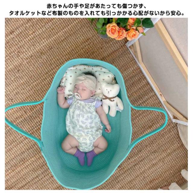 | 赤ちゃんがゆっくりお休みできるベビーバスケット。 赤ちゃんの手や足があたっても傷つかず、タオルケットなど布製のものを入れても引っかかる心配がないから安心。 使わない時は折りたたんで、コンパクトに収納可能。持ち手付きで、持ち運びもラクラク。 お子さまのおもちゃやインテリア小物、ランドリーバスケットとしてなど幅広くお使いいただけます。 ナチュラルテイストなのでお部屋のインテリアのアクセントにもぴったりです。 | |