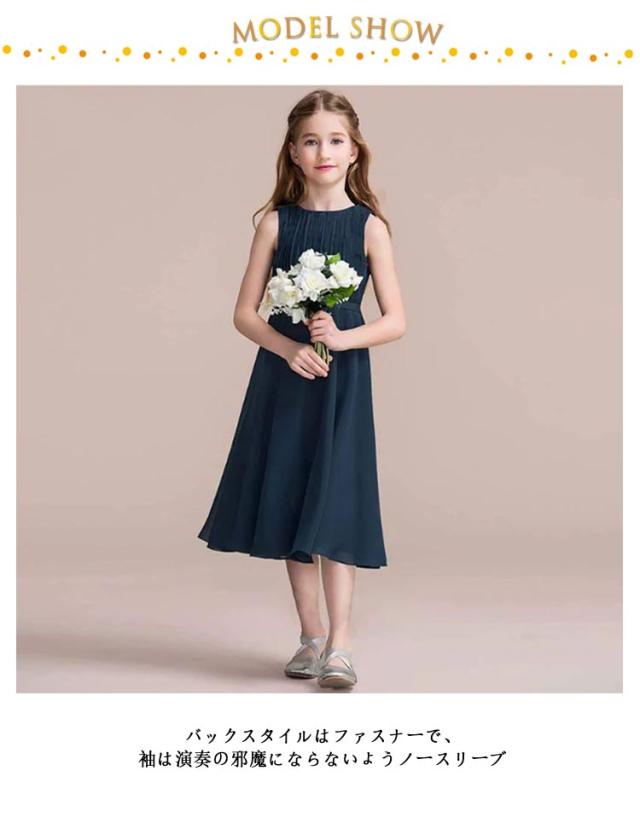 | 110-160cm ピアノやバイオリンの子供服 バックスタイルはファスナーで、袖は演奏の邪魔にならないようノースリーブ♪ 胸元の繊細プリーツが魅力で、シンプルでおしゃれ♪ | |