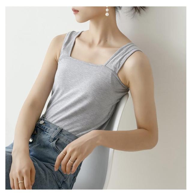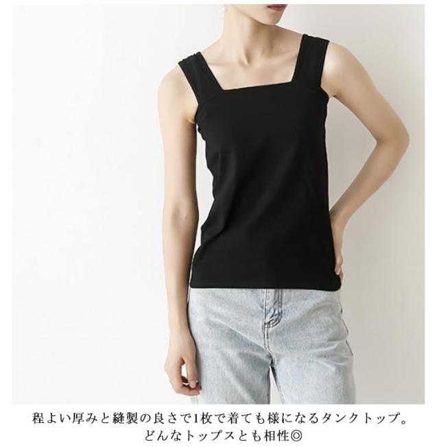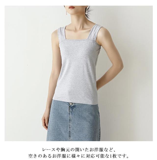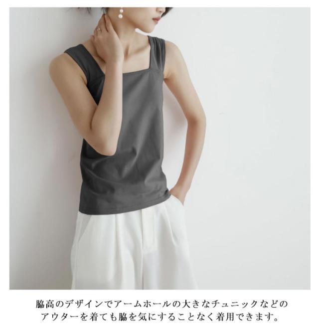 | 柔らかく伸びのいい素材が、胸元や脇下にぴったりなブラ紐を隠せるインナー。 スクエアネックのすっきりとした胸元は、Vネックトップスとの重ね着に好相性。 幅広な肩紐がブラ紐も隠してくれるので、透け感トップスと重ねるコーデにもぴったりです。 程よい厚みと縫製の良さで1枚で着ても様になるタンクトップ。どんなトップスとも相性◎ 脇高のデザインでアームホールの大きなチュニックなどのアウターを着ても脇を気にすることなく着用できます。 レースや胸元の開いたお洋服など、空きのあるお洋服に様々に対応可能な1枚です。 | |
