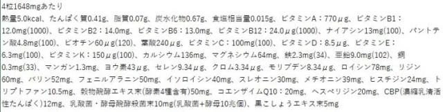 | ビタミンK含有納豆菌末(納豆菌(滅菌)、デキストリン)(スイス製造)、穀物醗酵エキス末、マンガン含有酵母、ユビキノン(コエンザイムQ10)、ヨウ素含有酵母、濃縮乳清活性たんぱく、乳酸菌・酵母醗酵殺菌末、セレン含有酵母、モリブデン含有酵母、黒こしょうエキス末、クロム含有酵母/貝カルシウム、セルロース、酸化マグネシウム、ビタミンC、ロイシン、リジン塩酸塩、グルコン酸亜鉛、バリン、フェニルアラニン、メチオニン、イソロイシン、ステアリン酸Ca、スレオニン、ヒスチジン、クエン酸鉄Na、ヘスぺリジン、ビタミンB6、ビタミンB2、ナイアシン、ビタミンB1、トリプトファン、微粒二酸化ケイ素、ビタミンE、セラック、ヒドロキシプロピルセルロース、パントテン酸Ca、香辛料抽出物、グルコン酸銅、ビタミンA、β-カロテン、葉酸、カルナウバロウ、ビオチン、ビタミンB12、ビタミンD3、(一部に小麦・乳成分・大豆を含む) |