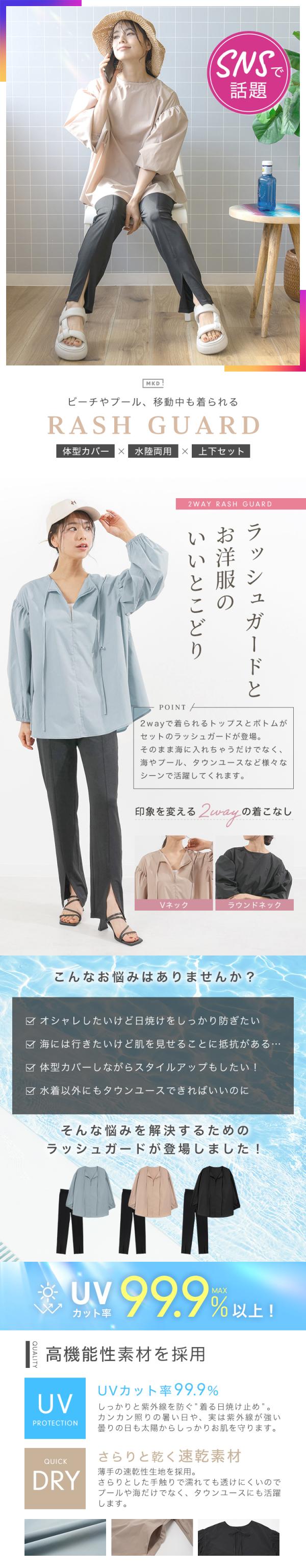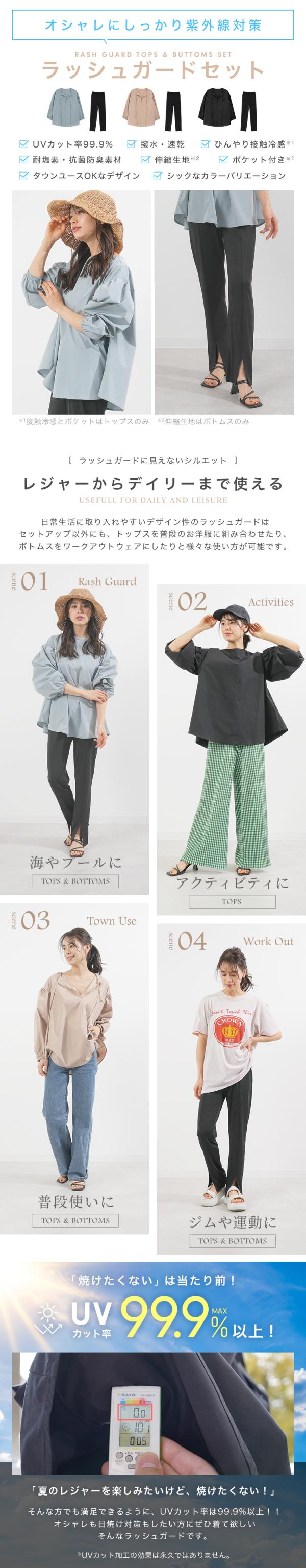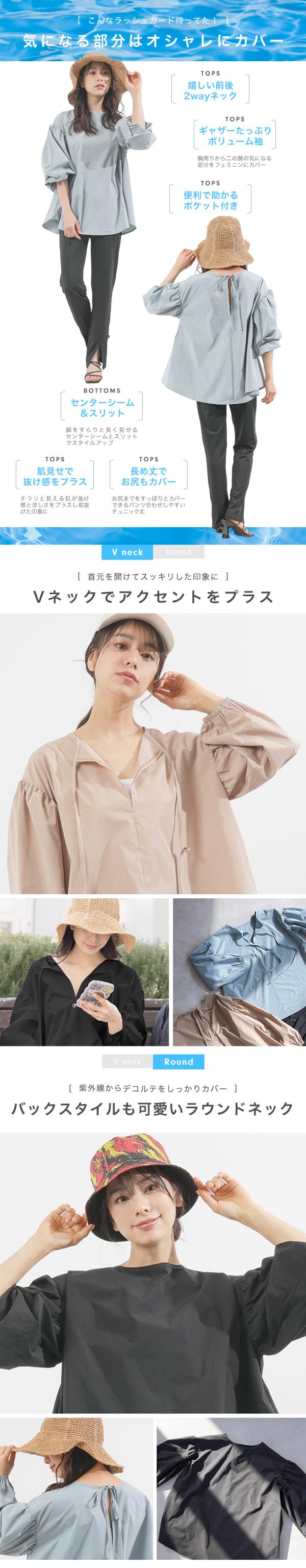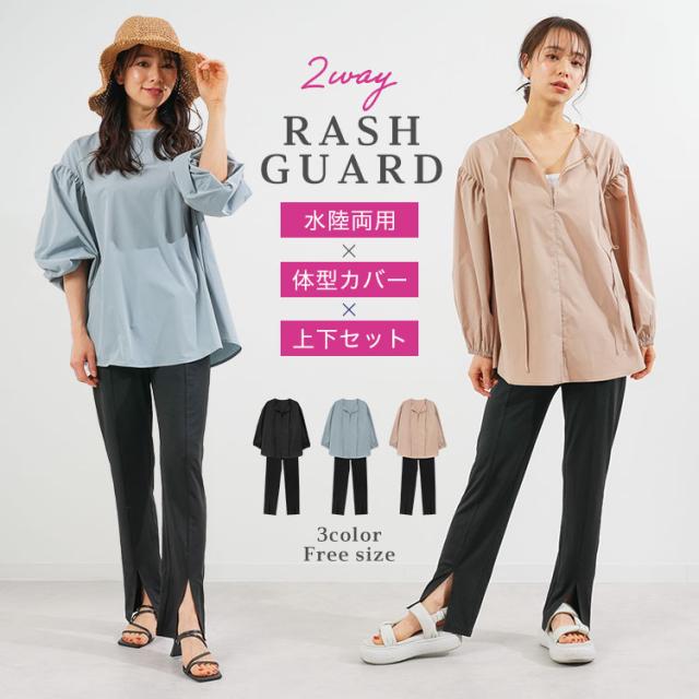 ラッシュガード トップス パンツ ボトムス セット 水着 普段着 レディース ママ 体型カバー 可愛い 長袖 上着 水陸両用 フードなし 大きいサイズ UVカット 日焼け対策 パフスリーブ 前後リバーシブル アウトドア 海 川 プール