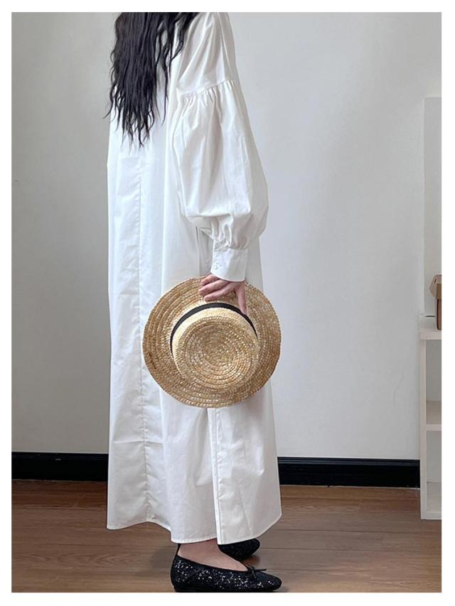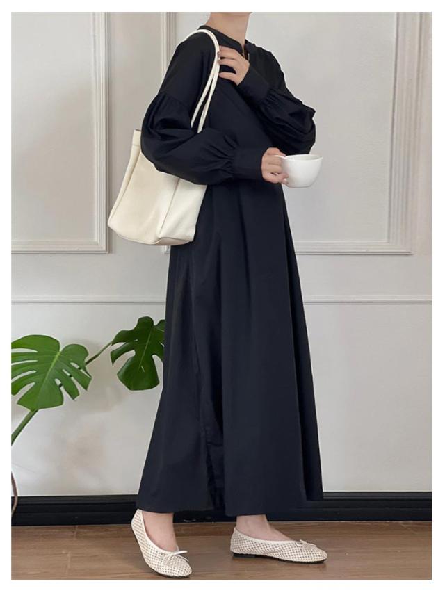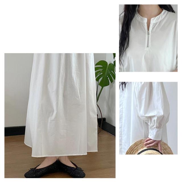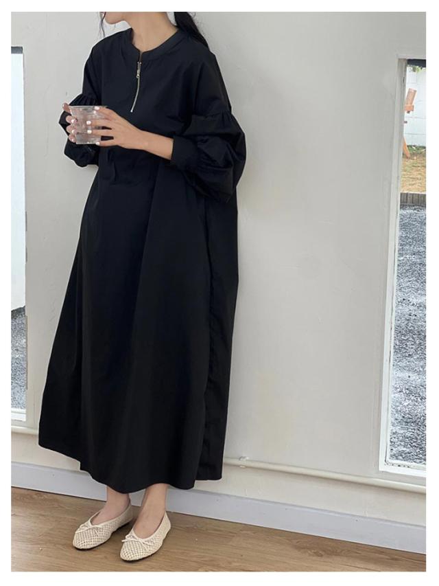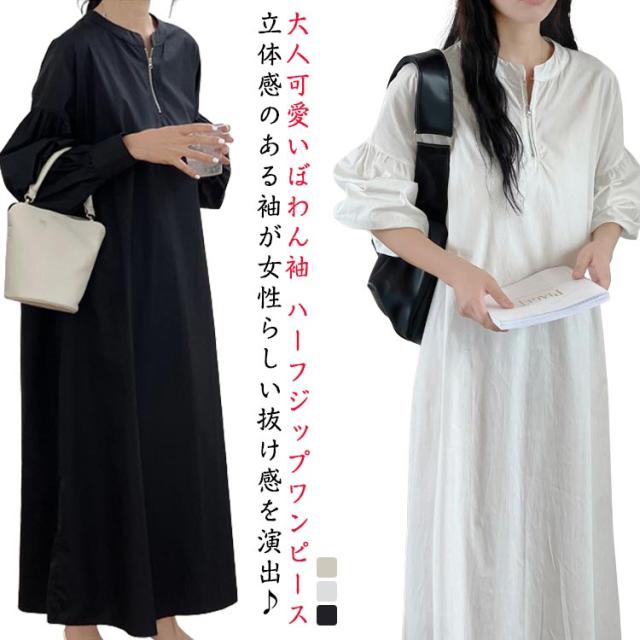 ゆったり ボリューム袖 ワンピース ロング ロングワンピース ワンピース ワイドサイズ 丈 ハーフジップ ロングワンピ マキシ ロング丈 レディース 長袖 春 秋 Aライン ワンピ カジュアル 無地 大人