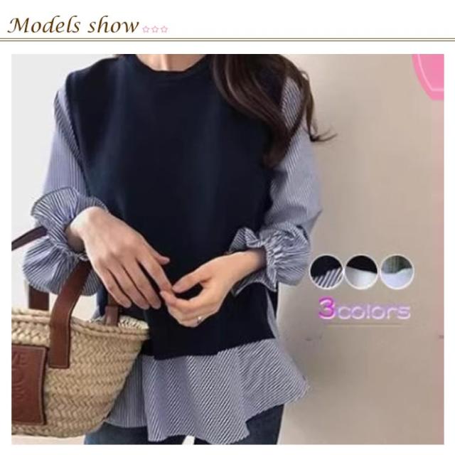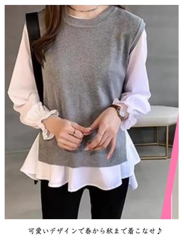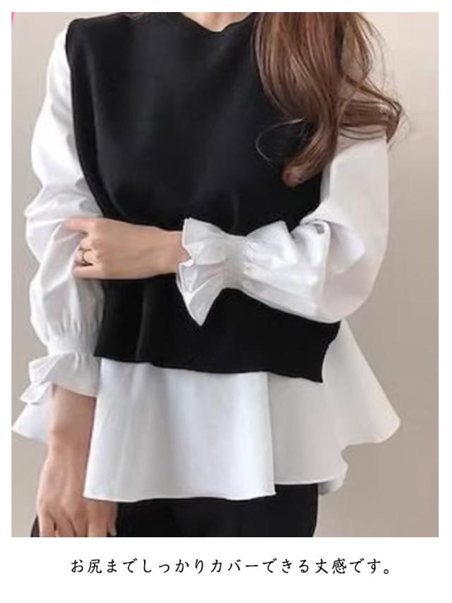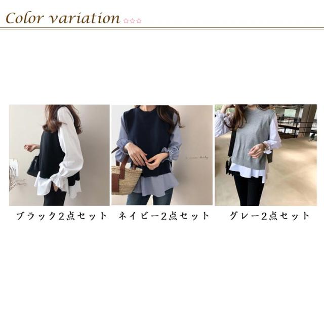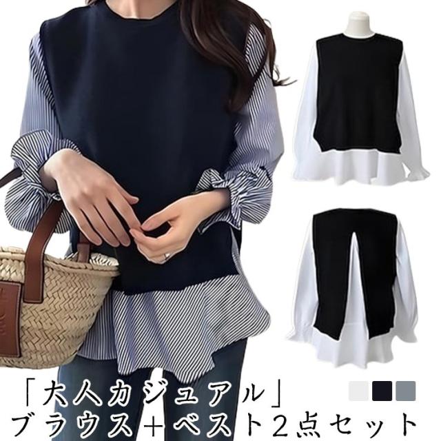 シャツブラウス 2点セット シャツセット ブラウス レデイーズ シャツセット 春 秋 ニットベスト 重ね着 シャツ ニット 長袖 フリル ストライプ カットソー トップス レイヤード バックオープン プルオーバー ワンピスター