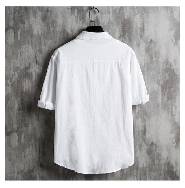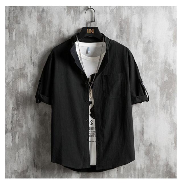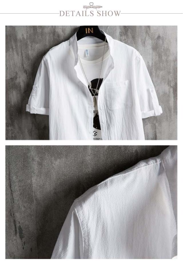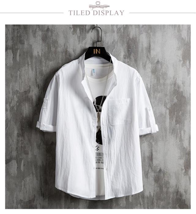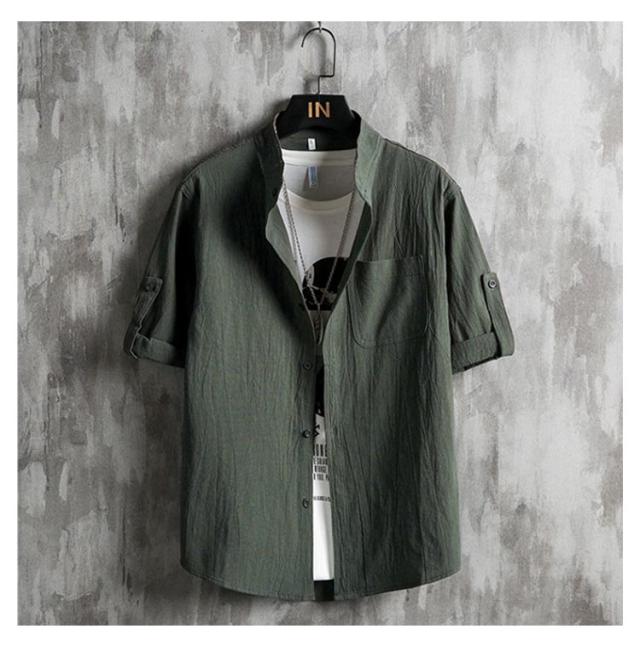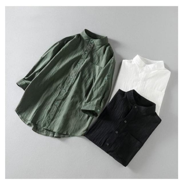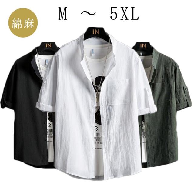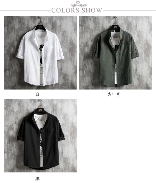 メンズ シャツ 夏 春 黒 無地 麻シャツメンズ 五分袖 七分袖 ノーカラーシャツ リネンシャツ メンズ ブラウス スタンドカラー 長袖 夏 カジュアルシャツ スタンドカラー UVカット tシャツ トップス 細身 おしゃれ 通勤 白 黒 ホワイト ブラック