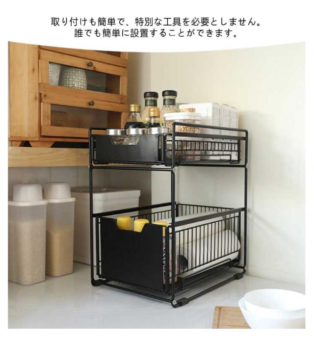 ブラック スライド なべ ステンレス製 伸縮 シンク下スライドラック 棚 滑り止めゴム付 キッチン ラック コンロ下収納 2段 台所収納 バスケット 引き出し シンク下 スリム シンク下 フライパン 鍋 収納 棚 引出し キッチンラック キッチン収納 台所収納 隙間収納