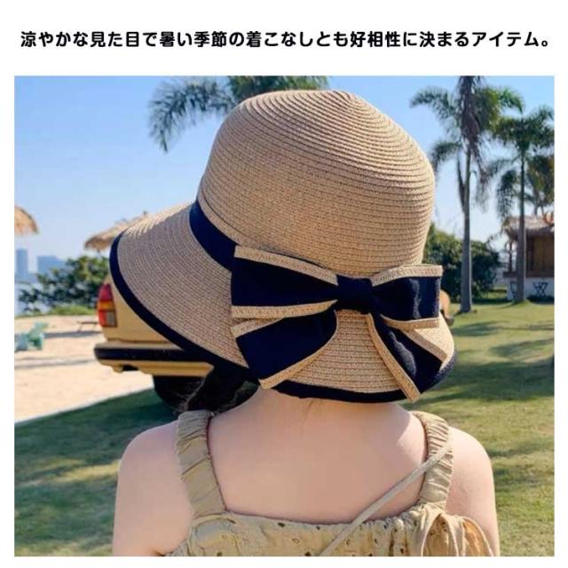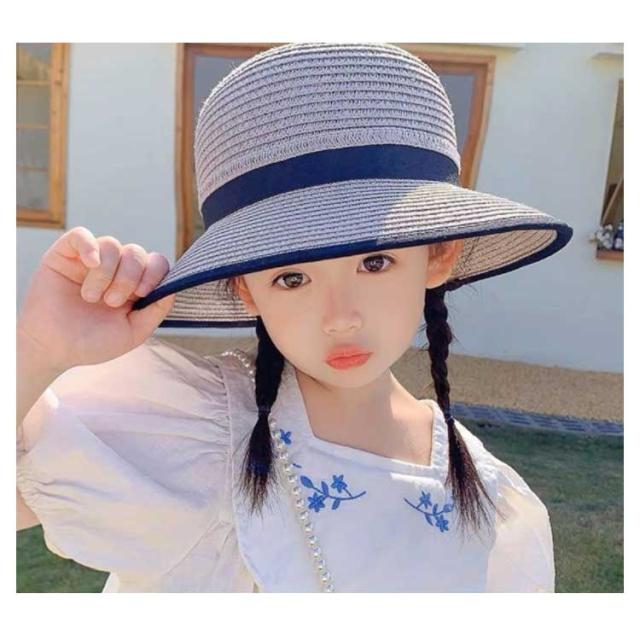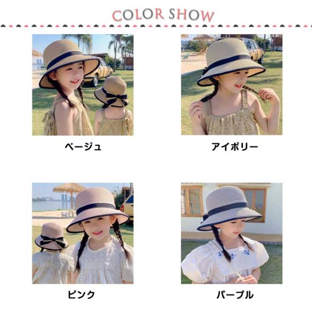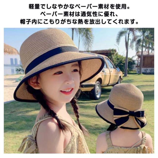 麦わら帽子 リボン キッズ 女の子 帽子 ハット つば広 あご紐付 ペーパーハット ストローハット 麦わらハット uvカット 日除け 遮光 紫外線対策 熱中症対策 通気性 日焼け防止 夏 春 日除け帽子 かわいい アウトドア 外遊び 旅行 56cm 【送無】