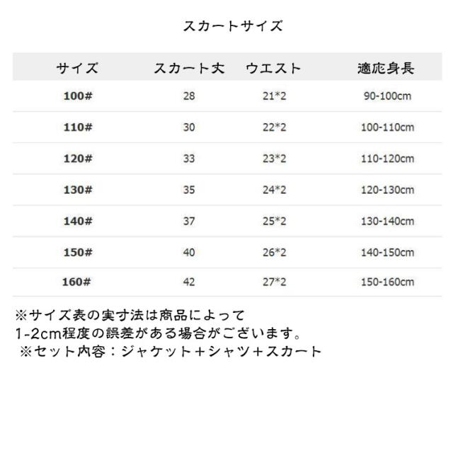 | サイズについての説明 | ※サイズ表の実寸法は商品によって1-2cm程度の誤差がある場合がございます。 ※セット内容:ジャケット+シャツ+スカート |