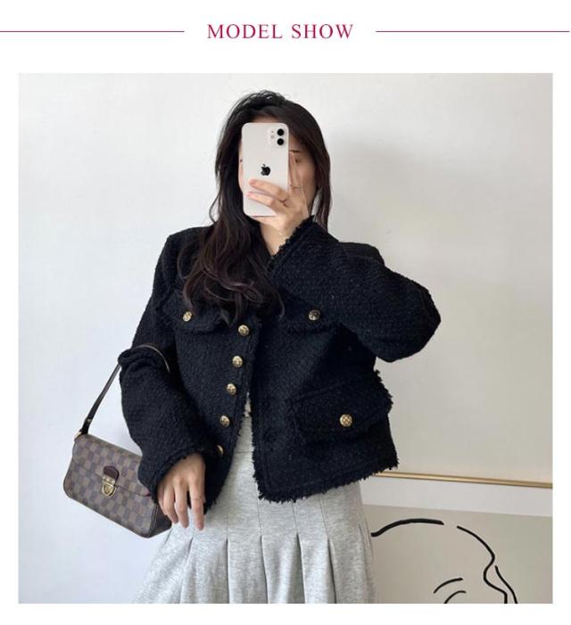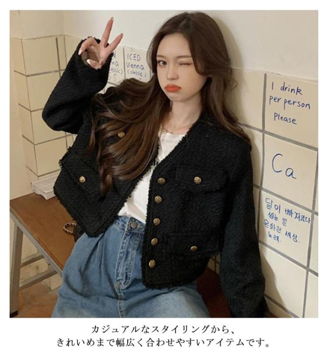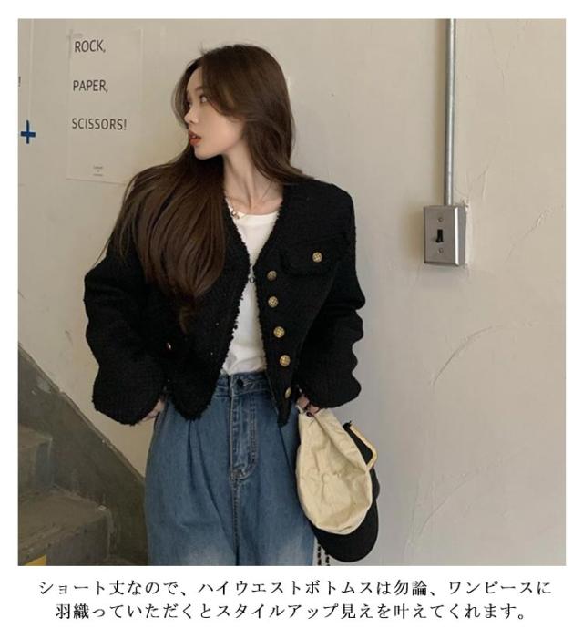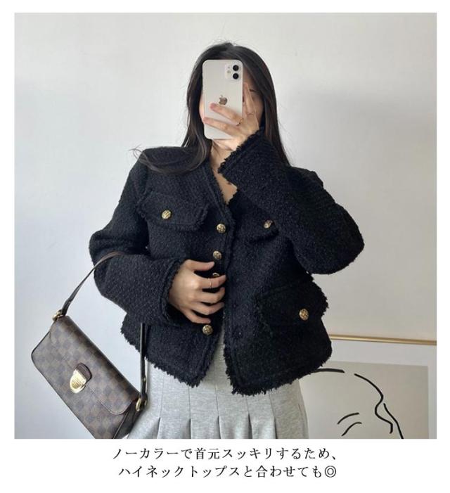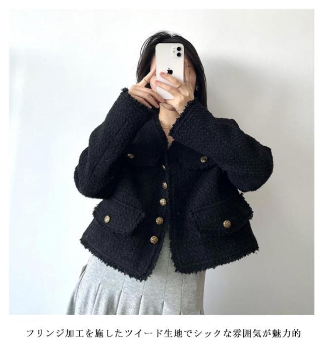 春 ツイードジャケット ノーカラー レディース フリンジ 夏 ツイード 黒 薄手 金ボタン ショートジャケット アウター ジャケット ノーカラージャケット ショート丈 羽織り 通勤 カジュアル 普段使い きれいめ おしゃれ 韓国 ファッション