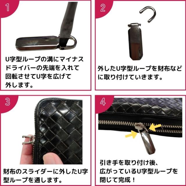 2 取り付けたい財布・バッグなどのスライダーのリングに、U字型ループ金具を通します。