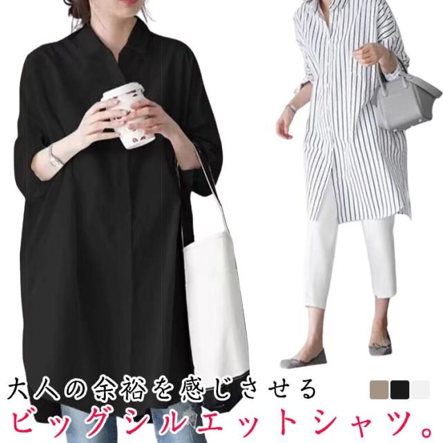 ビッグシルエット ブラウス シャツ レディース 長袖 ロング ロングシャツ シャツブラウス チュニック ビッグシャツ 彼シャツ 白シャツ チュニックシャツ 長袖シャツ 春 夏 秋 トップス ワンマイルウェア 無地 ストライプ
