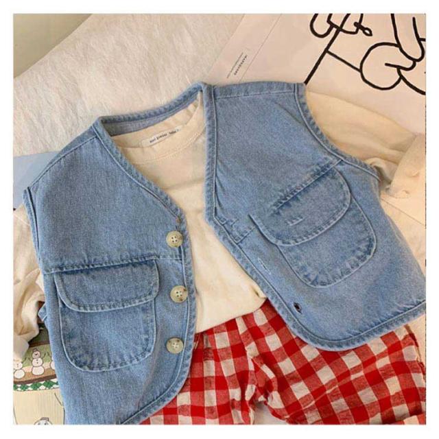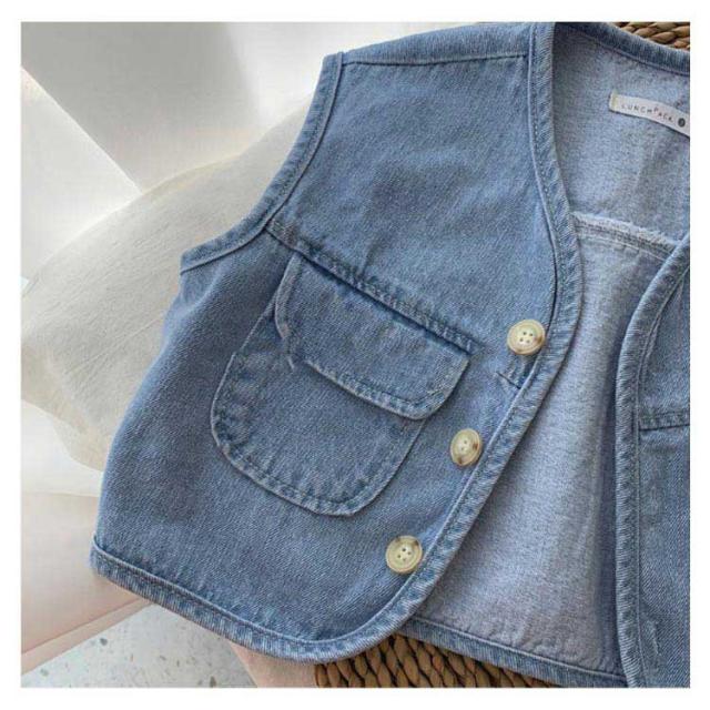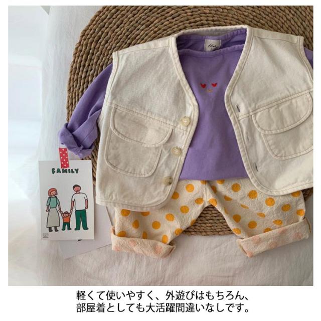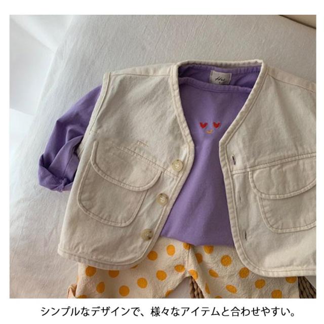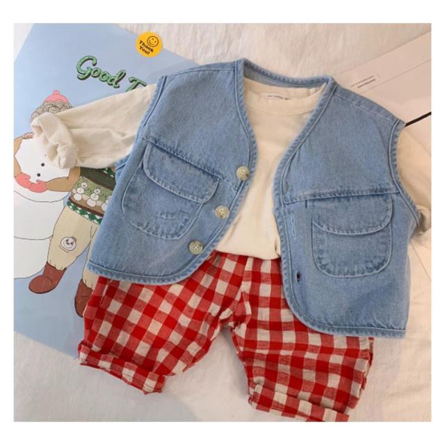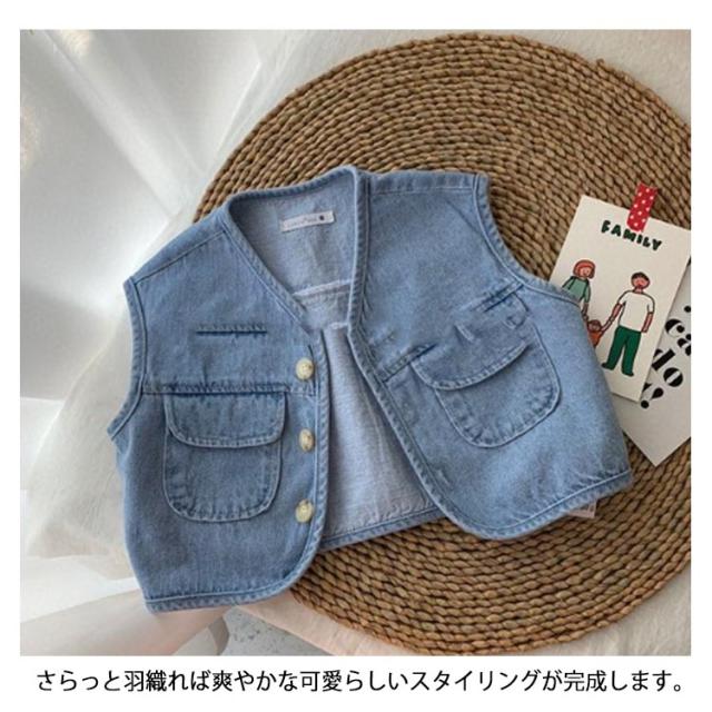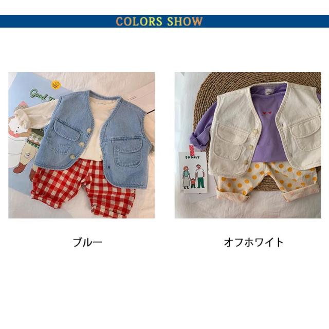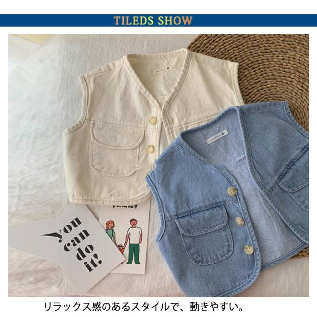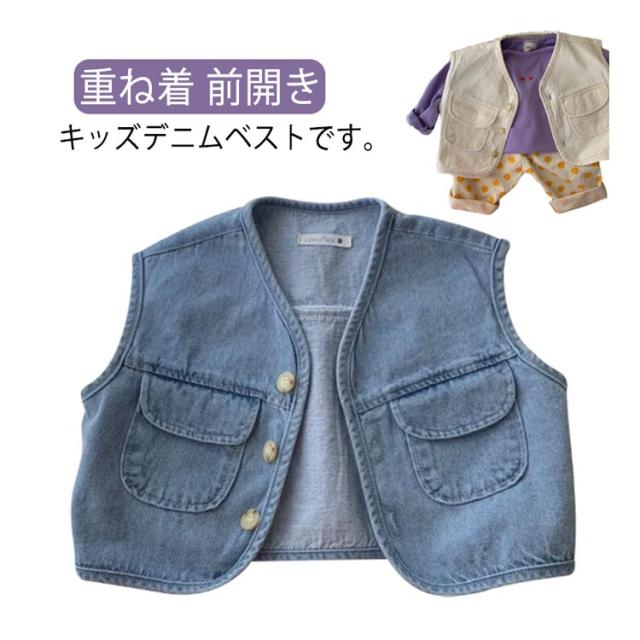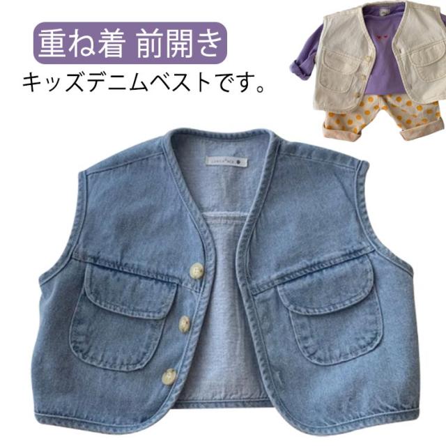 キッズ デニム ベスト 子供服 デニムベストレイヤード 重ね着 前開き おしゃれ シンプル 無地 トップス ノースリーブ 女児 男児 ボタン付き 春秋 薄手 カジュアル 男の子 女の子 普段着 春 夏 秋 通園 公園 外遊び 保育園 幼稚園 オフホワイト ブルー 送料無料