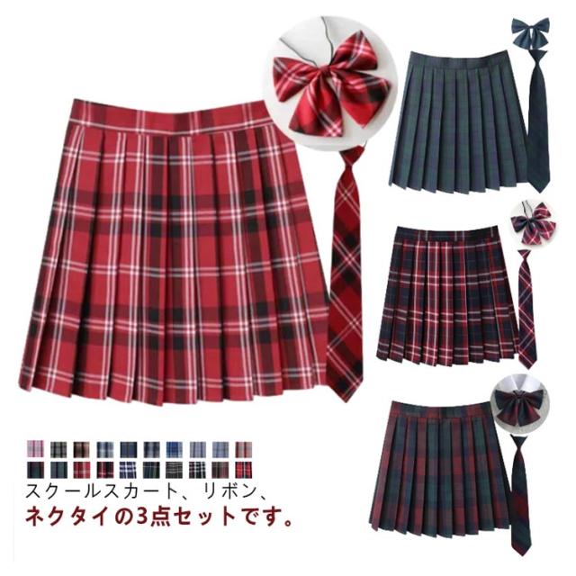 スクール スカート 3点セット チェック プリーツ スカート リボン付き ネクタイ付き 送料無料 高校生 中学生 学生 学校 通学 制服 女子 入学 高校 中学 女子高生 学生服 入学式 卒業式 スカート オールシーズン コスプレ 仮装 コスチューム 送料無料
