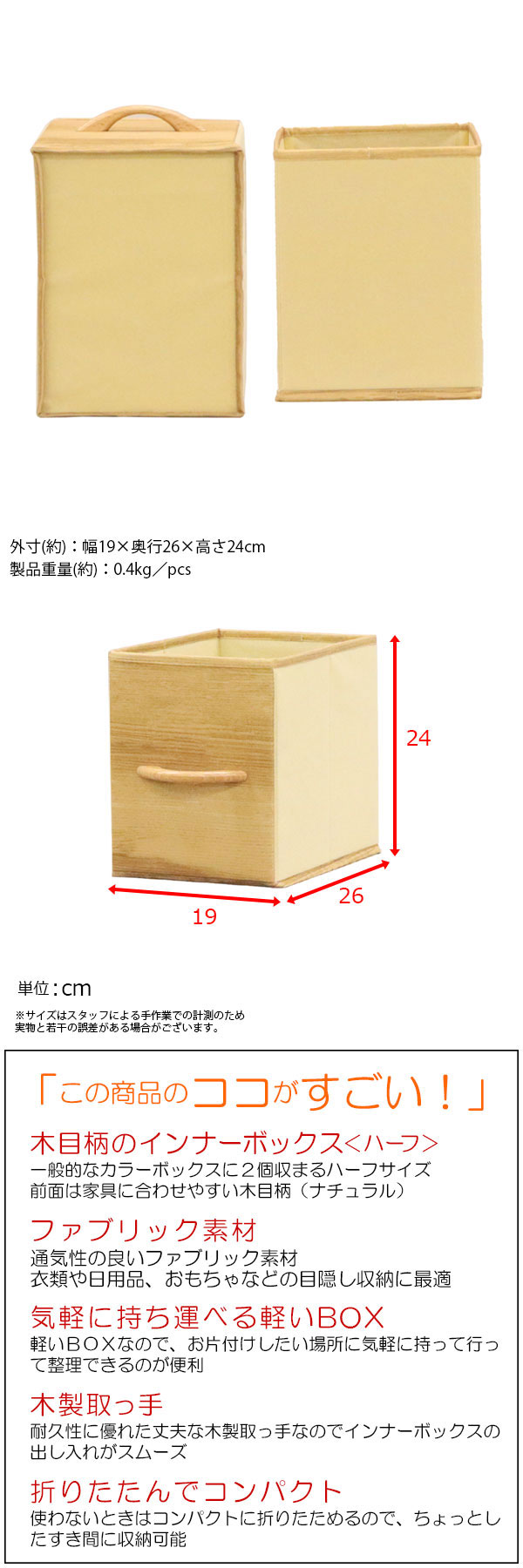 商品名:カラーボックス 収納 インナーボックス 縦 ハーフ 幅19cm 奥行26cm 高さ24cm 縦型 縦置き 完成品 天然木の取っ手付き おしゃれ 木目調 カラーボックス収納ボックス カラーボックス 引き出し収納ケース 布 軽量 丈夫 スチールラック ナチュラル 目隠し収納 単品 インテリア 収納家具 ワイヤーラック 一人暮らし ワンルーム 整理整頓 隠す収納