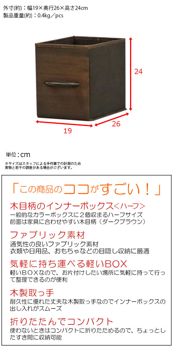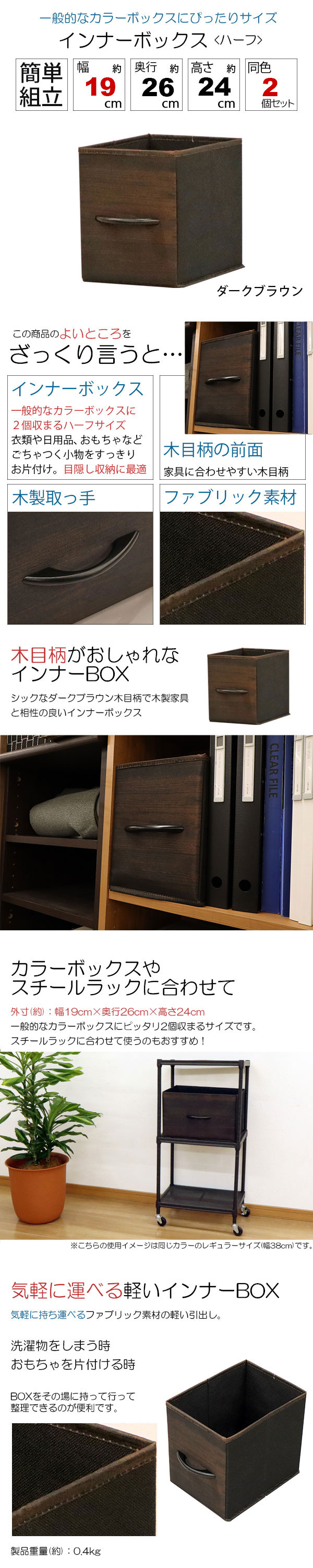 カラーボックス 収納 インナーボックス 縦 ハーフ 幅19cm 奥行26cm 高さ24cm 縦型 縦置き 完成品 同色2個セット 天然木の取っ手付き おしゃれ 木目調 カラーボックス収納ボックス カラーボックス 引き出し収納ケース 布 軽量 丈夫 スチールラック 目隠し収納 ダークブラウン