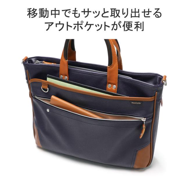 デザイン、コストパフォーマンスに優れたモノづくりに加え、多様なビジネスシーンでのニーズに応える多彩なラインナップを用意した『moustache on time』。柔らかい手触りのシボ合皮に上品で落ち着いたデザインが魅力です。多彩なポケットやマチの拡張時に対応する底芯など、機能的な設計でビジネスライフをサポートします。