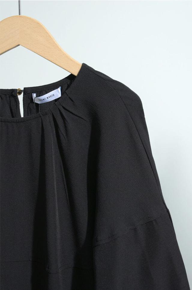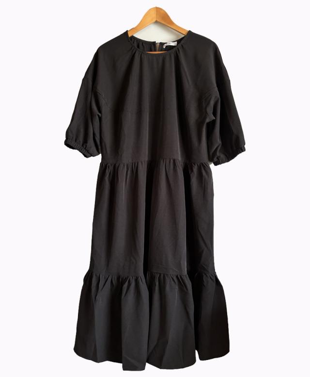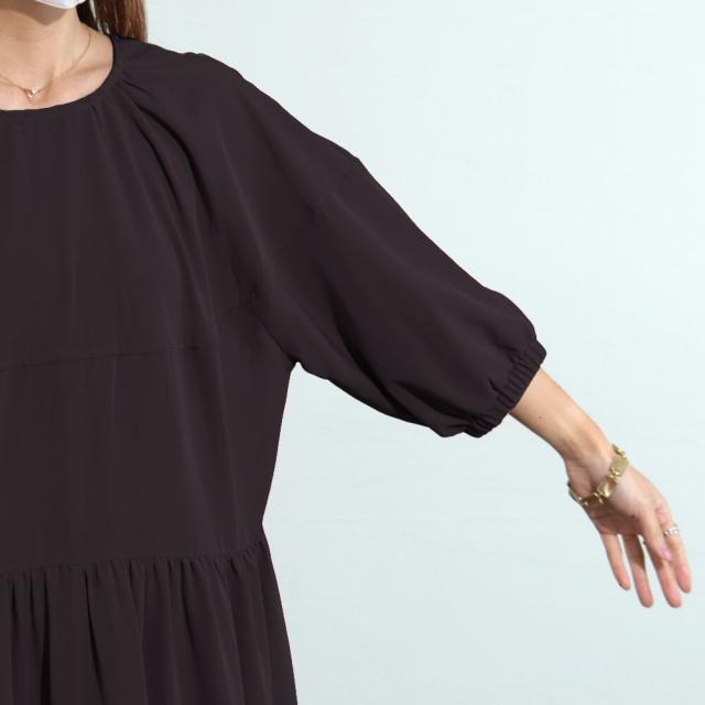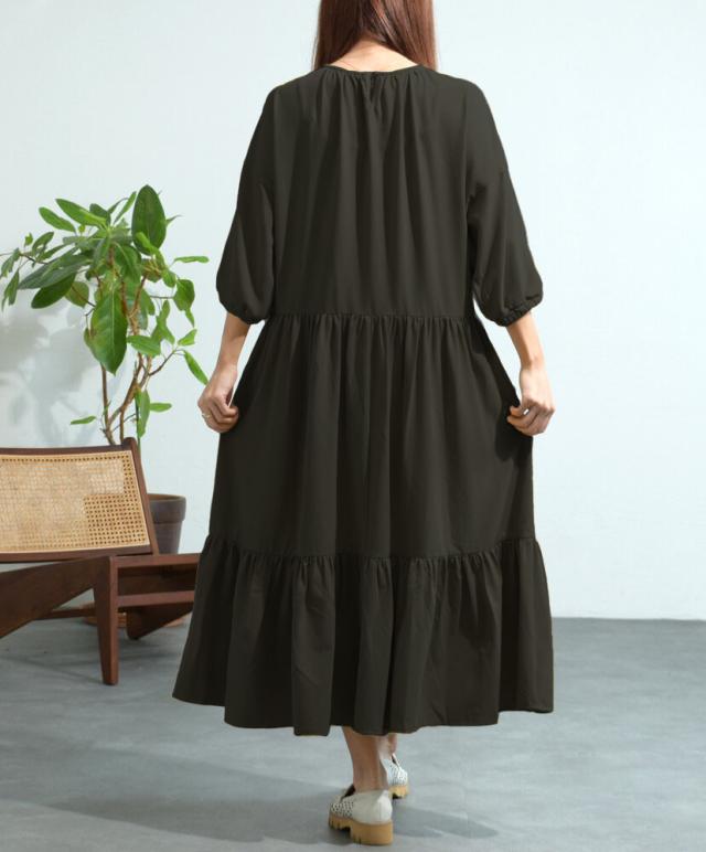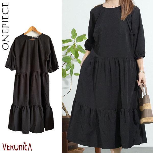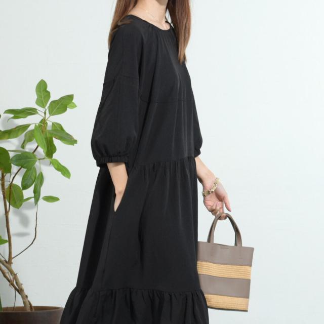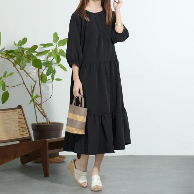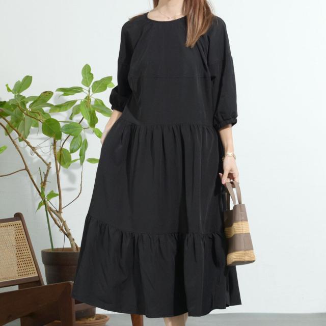 【即納】シャーリングデザインティアードワンピース 膝下丈 カジュアル フェミニン 無地 春夏