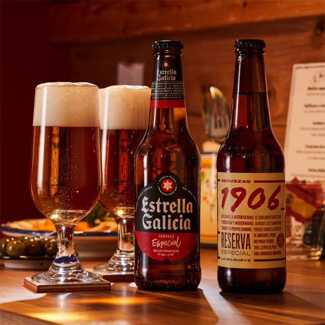ガリシア州の豊かな自然から得られた軟水を用い、100年以上も変わらぬ伝統製法と厳選された麦芽やホップを用いて造られる高品質のエストレーリャ・ガリシア。スペインを代表するラガービール、「エストレーリャ・ガリシア セルベサ エスペシアル」と、創業の年をラベルにしたスペシャルな「1906 レゼルヴァ・エスぺシアル」を飲み比べ。キレのある定番と、焙煎モルトの深い香りと上品な苦みが特長のビール2種類をお楽しみいただけます。