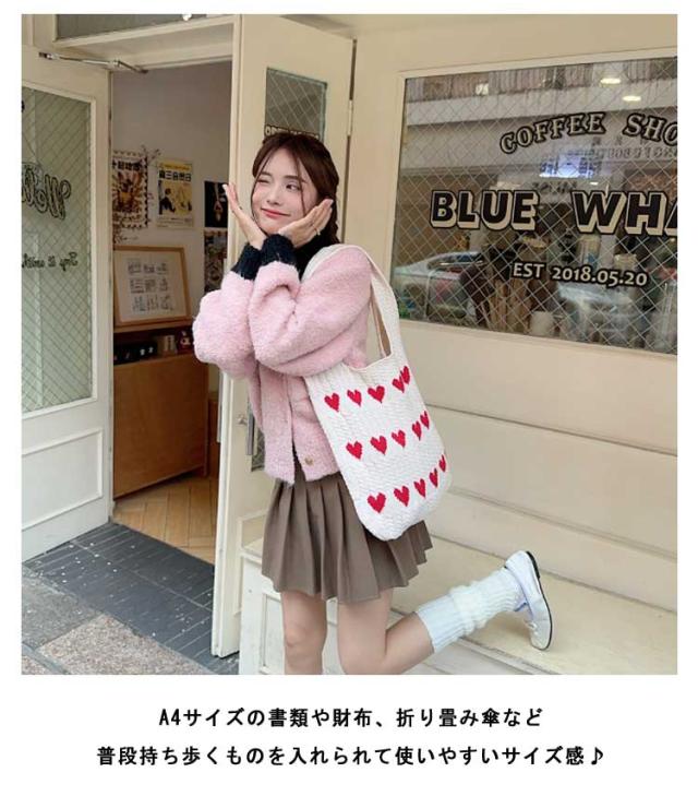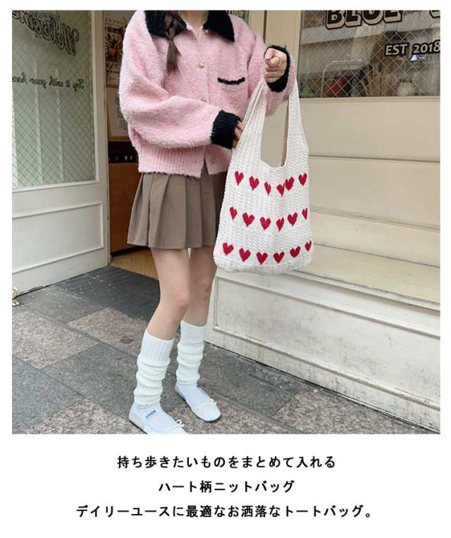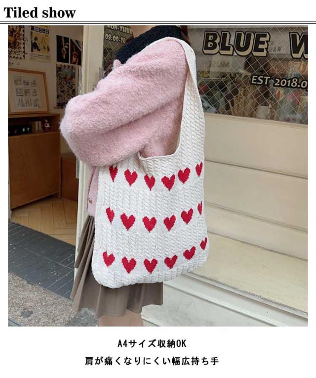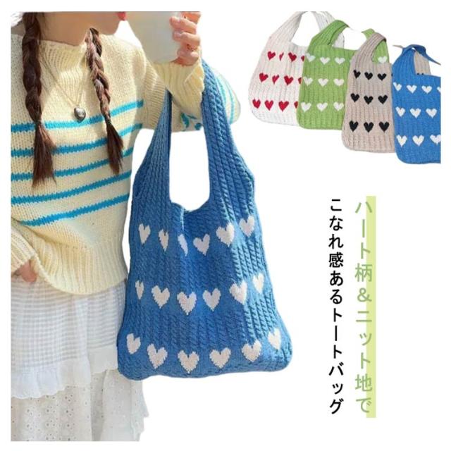 エコバッグ レディース ハート柄 収納可能 ニットバッグ ニットトート ハート ニットバッグ ニット生地 通勤 ディリー トート トートバッグ かばん 肩掛けカバン 鞄 通学 日常 A4サイズ 普段使い 通学 買い物 シンプル カジュアル ナチュラル